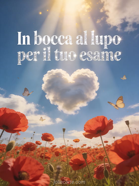 Invia un messaggio caloroso e incoraggiante a chi si prepara per un esame con questo bellissimo biglietto con cielo azzurro, nuvole a cuore e un campo di papaveri rossi.