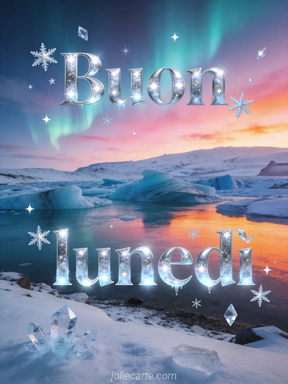 Invia un gif scintillante buon lunedì scintillante con lettere argentate ghiacciate, stelle gelide e gli iceberg blu di Jokulsarlon sotto un tramonto rosa e arancione. Condividi un augurio invernale fiabesco e scopri anche buongiorno buon lunedì baci immagine, buon lunedì soleggiato gif o lunedì baci immagini.