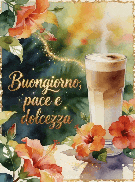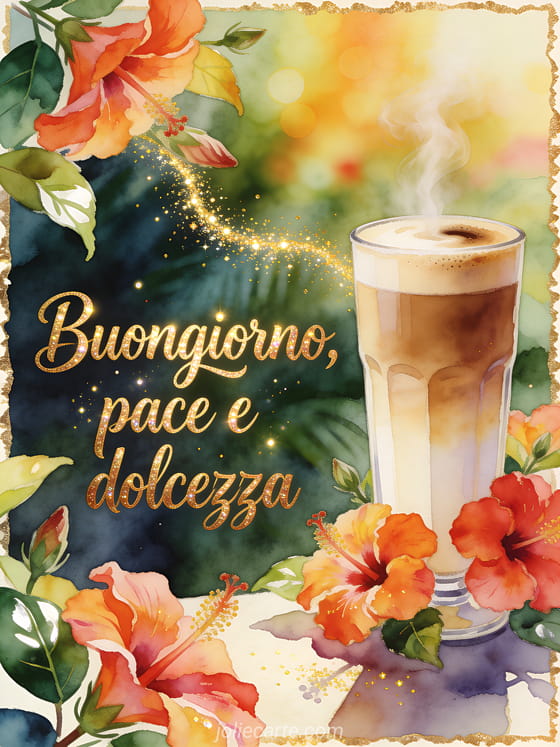 Condividi un mattino tropicale luminoso con questo biglietto ad acquerello, con un bicchiere alto di latte, petali vividi di ibisco, foglie lucide e scintille dorate intorno al vapore. Scopri anche caffè buongiorno mia cara, caffè del mattino buongiorno o immagine buongiorno caffè gratis.