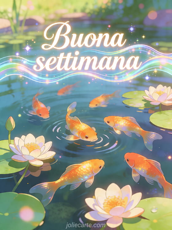 Condividi questo sereno biglietto di buona settimana con pesci dorati, ninfee e uno stagno tranquillo. Puoi anche scoprire buona settimana gif umorismo, gif buona settimana baci e messaggio buona settimana.