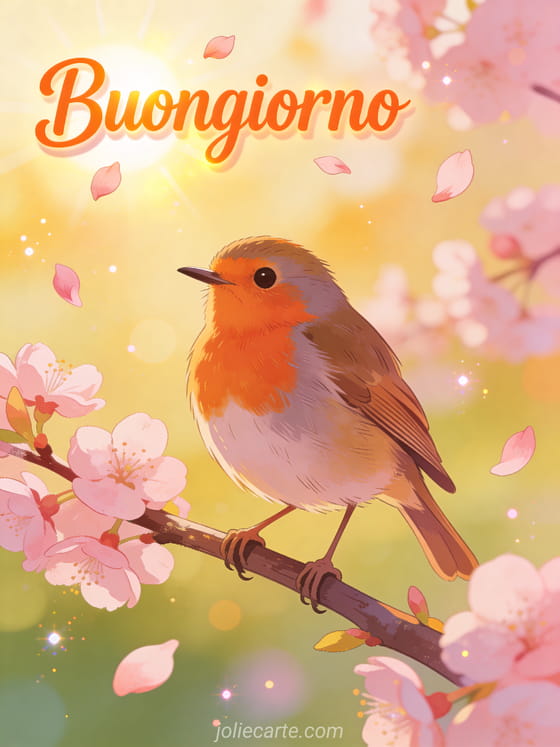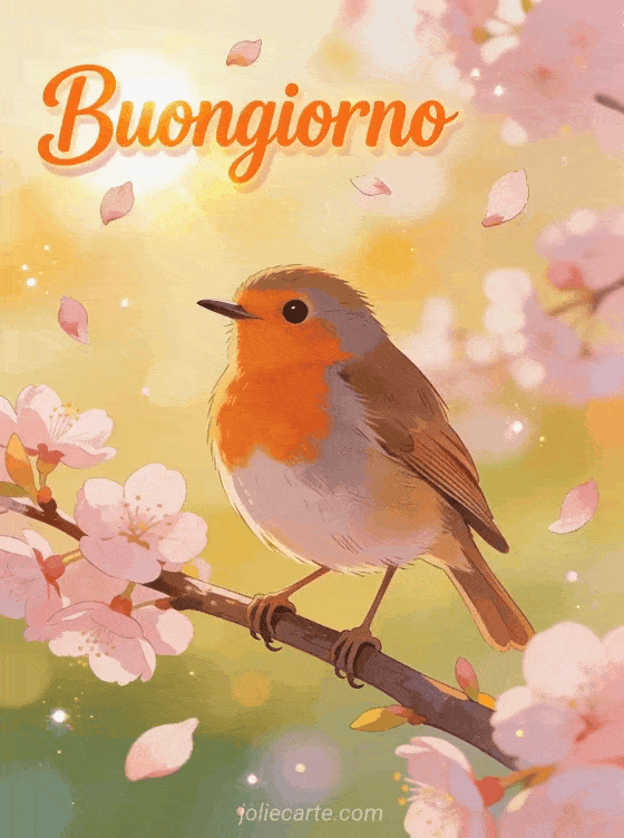 Gifs buongiorno di mercoledì un tenero pettirosso tra i fiori di ciliegio per un bel mercoledì mattina
