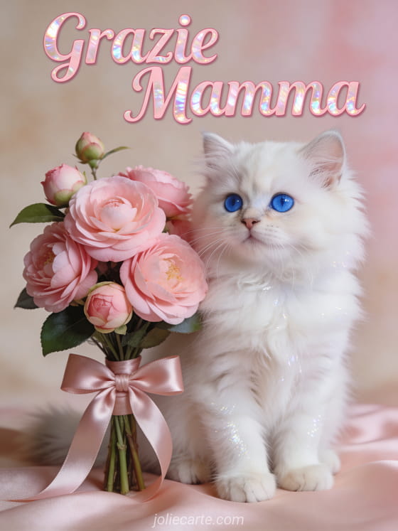 Mostra la tua gratitudine alla mamma con questo tenero biglietto di auguri gratuito. Un adorabile gattino persiano bianco dagli occhi azzurri seduto accanto a un delicato mazzo di camelie rosa legato con un nastro di raso, su uno sfondo rosa delicato. Scopri anche un biglietto con fiori per la Festa della Mamma, un biglietto per la Festa della Mamma o un biglietto con immagini per la Festa della Mamma.