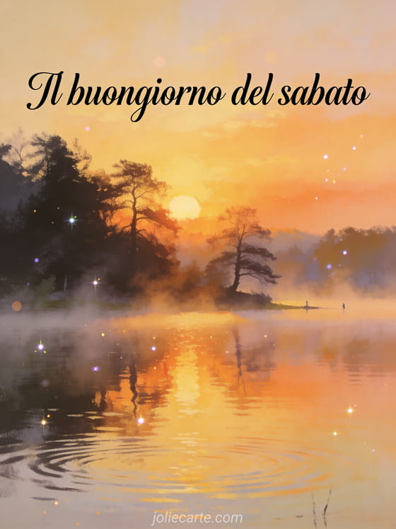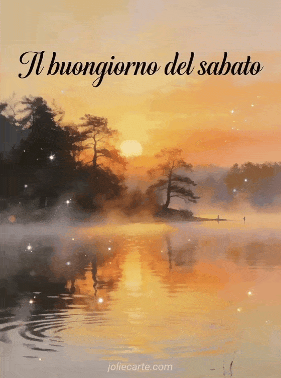 Condividi un saluto contemplativo del sabato con una splendida alba su un lago calmo, nebbia che sale e sagome di alberi riflesse nell'acqua. Scopri anche un gif romantico buon sabato, buon sabato buon weekend o buongiorno buon sabato gif animate.