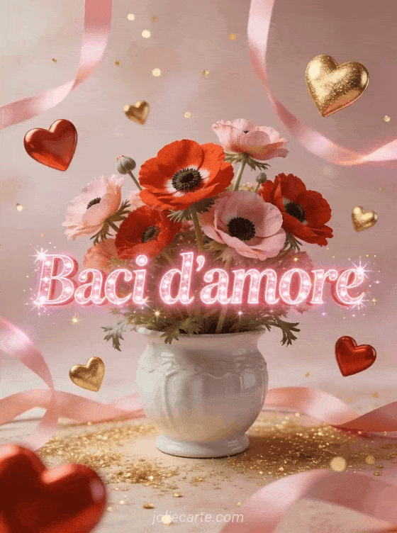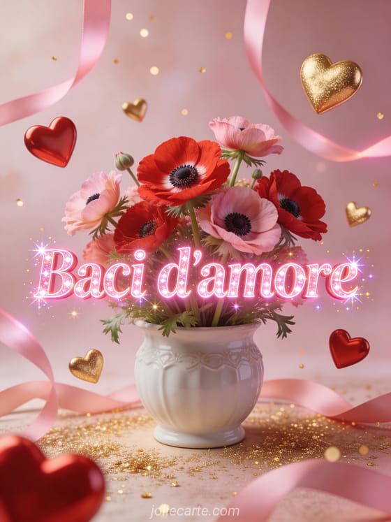 Invia questa romantica cartolina animata con le parole Baci d'amore scritte in lettere rosa luminose con effetto scintillante, con un bellissimo bouquet di anemoni rossi e rosa in un vaso di ceramica bianca, circondato da cuori 3D rossi e dorati fluttuanti. Scopri anche una amore abbraccio baci sul collo o un video baci d'amore.