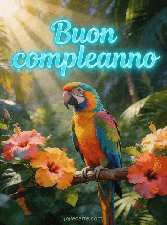 Festeggia con un'immagine animata di buon compleanno con un'ara multicolore, ibischi e atmosfera di giungla rigogliosa. Scopri anche compleanno animato, compleanno immagini animate e biglietto compleanno bambino gratis animato.