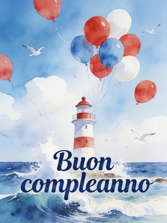 Invia questo incantevole biglietto di buon compleanno per uomo con un'illustrazione acquerello di un faro bianco e rosso in riva al mare con onde che si infrangono, palloncini colorati rossi, blu e bianchi che volano al vento e gabbiani in un cielo azzurro. Scopri anche un biglietto di compleanno per uomo o un biglietto di compleanno con umorismo per uomo.