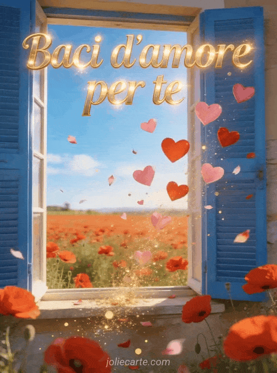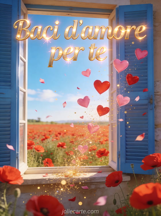 Invia questa romantica cartolina con le parole Baci d'amore per te scritte in lettere dorate con luce calda, con una finestra aperta con persiane blu che affaccia su un campo di papaveri rossi in estate, con cuori rosa e rossi che fluttuano verso il campo. Scopri anche una buongiorno baci innamorati o una baci con tutto il cuore immagine.