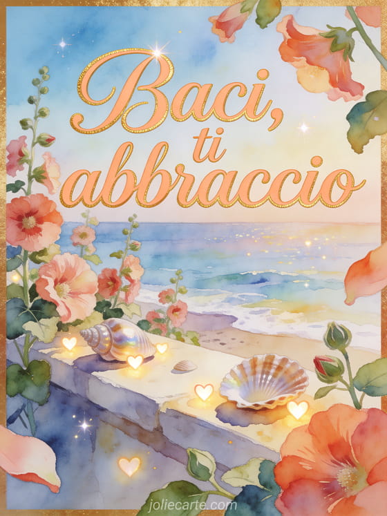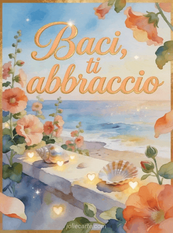 Condividi una calda cartolina ad acquerello con calligrafia albicocca, una sporgenza sul mare, petali di malvarosa, conchiglie levigate e piccole luci a cuore. Invia altro affetto con tanti baci gif animata, baci cane gif o gif coniglio bacini.