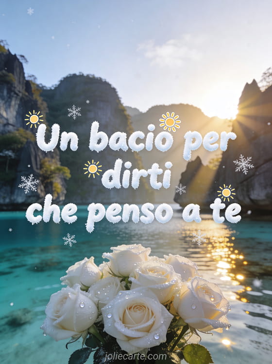 Invia un dolce bacio con questo bellissimo biglietto per dire a qualcuno di speciale che stai pensando a quella persona. Una calda illustrazione invernale con dolce luce del sole per illuminare la giornata. Scopri anche un biglietto ti amo penso a te o un biglietto d'amore penso a te.