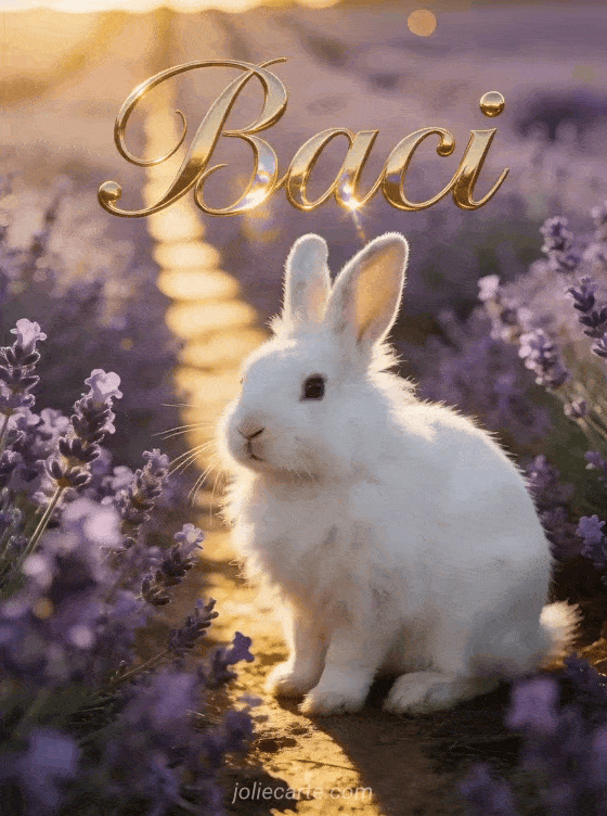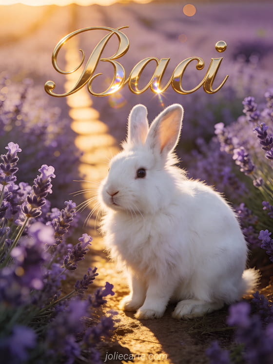 Condivida un tenero messaggio di baci con questo dolce biglietto che mostra un coniglio bianco soffice seduto in un campo di lavanda al tramonto. Scopra anche baci gif, loghi animati baci o gif pesce baci.