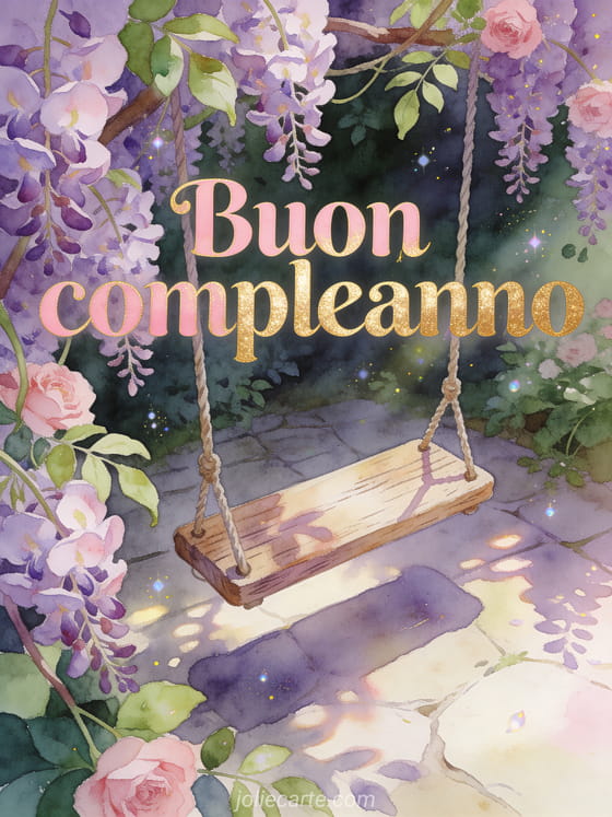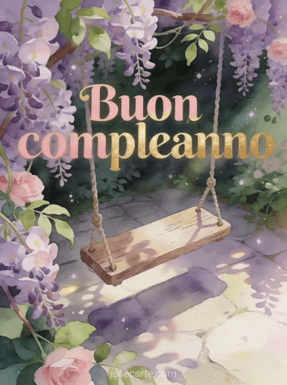 Condividi questo biglietto sognante con giardino segreto, altalena tra i glicini e atmosfera ad acquerello fiabesca. Scopri anche gif umorismo compleanno donna, buon compleanno donna testo e dromedario biglietto compleanno donna.