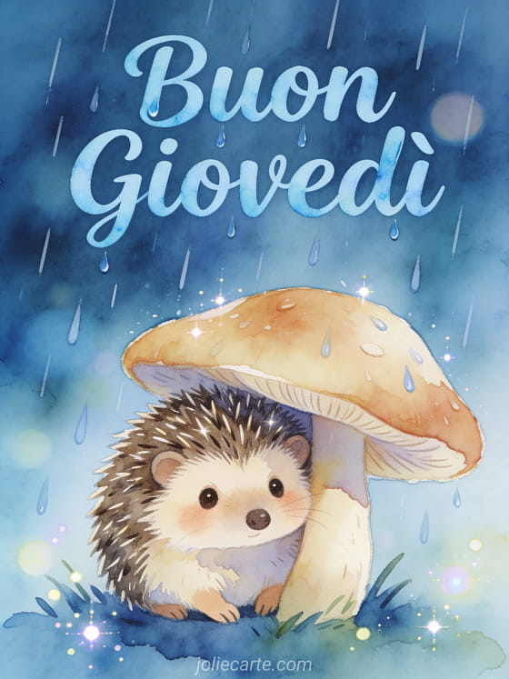 Immagine buon giovedì piovoso una tenera immagine di buon giovedì piovoso con un simpatico riccio sotto la pioggia