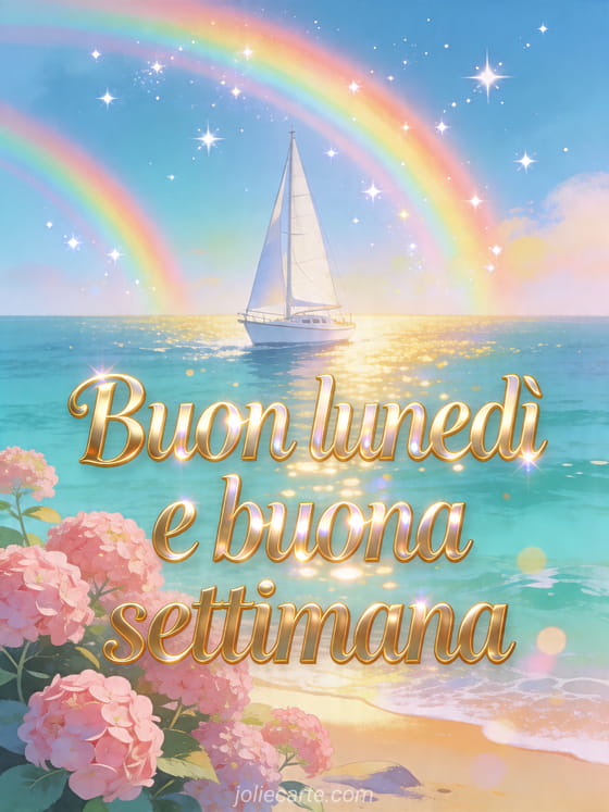 Condividi un luminoso augurio di buon lunedì e buona settimana con questa cartolina marina fotorealistica piena di luce dell'arcobaleno. Scopri anche caffè buon lunedì umorismo, lunedì immagine buongiorno o coraggio buongiorno lunedì.