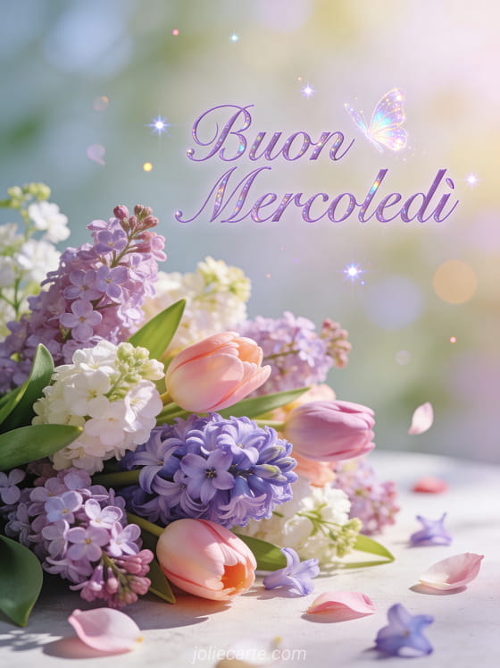 Illumina il mercoledì di qualcuno con questa bellissima cartolina con un fresco bouquet di fiori primaverili con lillà, tulipani e giacinti nella luce del mattino. Scopri anche una cartolina buon mercoledì bella immagine, una cartolina buongiorno mercoledì o una cartolina buon mercoledi baci.