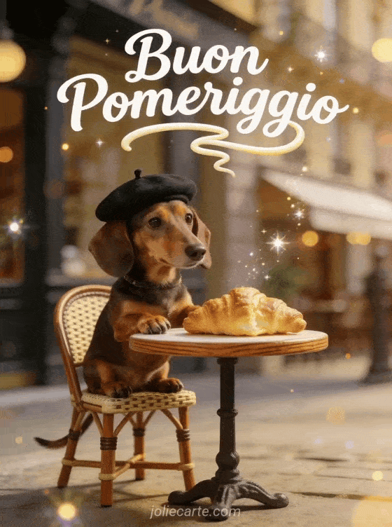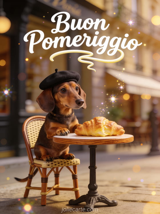 Condividi un sorriso con questa divertente cartolina di buon pomeriggio con un bassotto con il basco in un café parigino. Scopri anche una cartolina di immagine buon pomeriggio sole o di gif buon pomeriggio gratis.