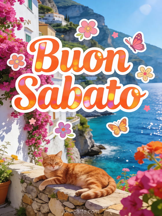Festeggia il fine settimana con questa allegra immagine di buon sabato con gatto. Scopri anche una cartolina bel sabato e buon fine settimana o una cartolina buon sabato e buona giornata.
