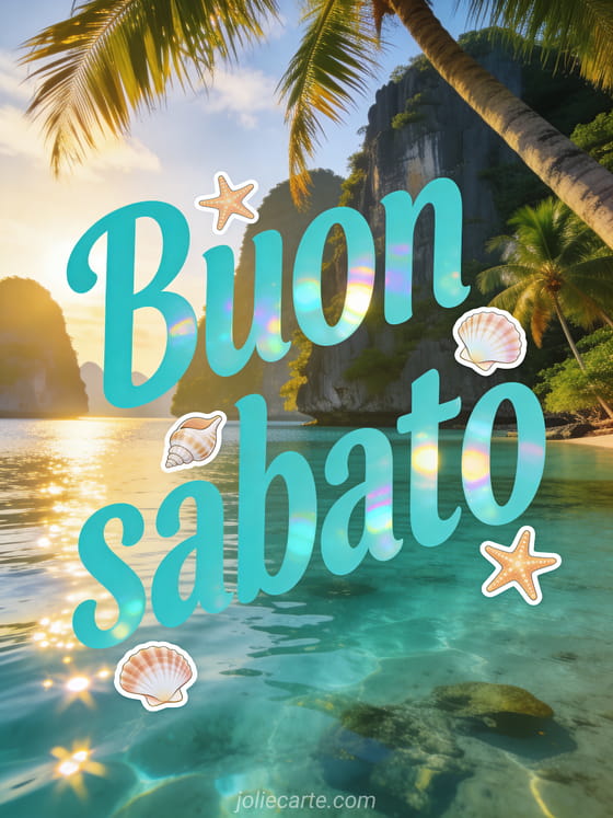 Invia un'immagine buon sabato tanti baci con lettere turchesi, riflessi iridescenti, conchiglie, stelle marine e la laguna cristallina di El Nido a Palawan. Condividi un augurio soleggiato per il weekend e scopri anche buongiorno buon sabato, salam aleykoum buon sabato o buon sabato caffè gif.