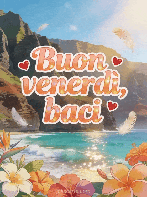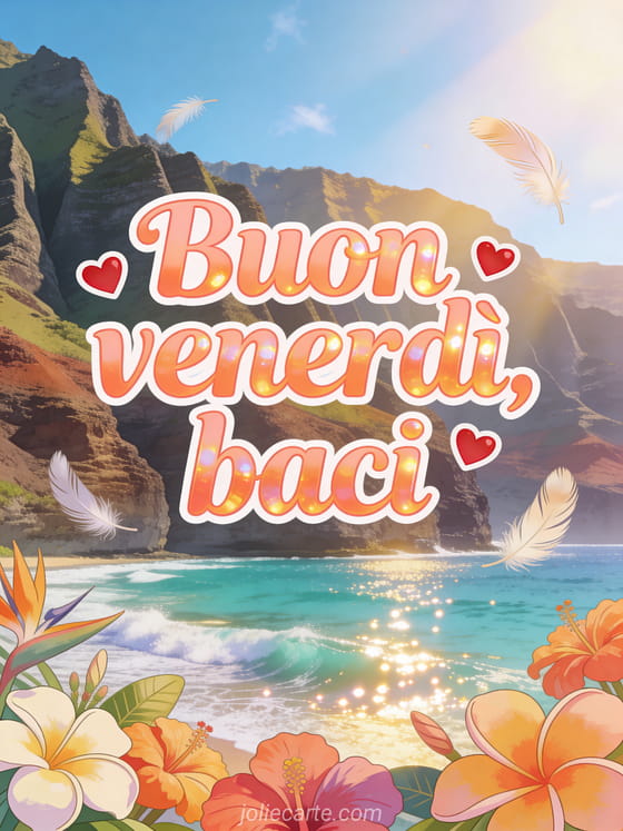 Invia un'immagine buon venerdì baci con lettere corallo morbide, piccoli cuori rossi, piume leggere e la spettacolare costa di Na Pali nel sole dorato d'inverno. Condividi un augurio tenero di fine settimana e scopri anche cartolina buon venerdì, buon venerdì divertente umorismo gif o buon venerdì baci gif animate.