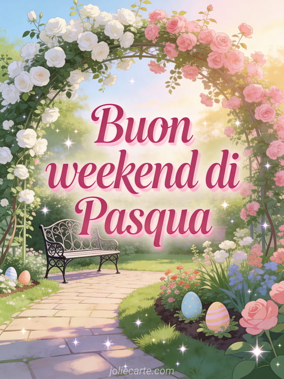 Augura un buon weekend di Pasqua con questo romantico biglietto con un rigoglioso giardino inglese, rose rampicanti, una panchina in ferro e uova di Pasqua nascoste tra i fiori. Scopri anche un biglietto di weekend di Pasqua, bella immagine di Pasqua o augurio di weekend di Pasqua.