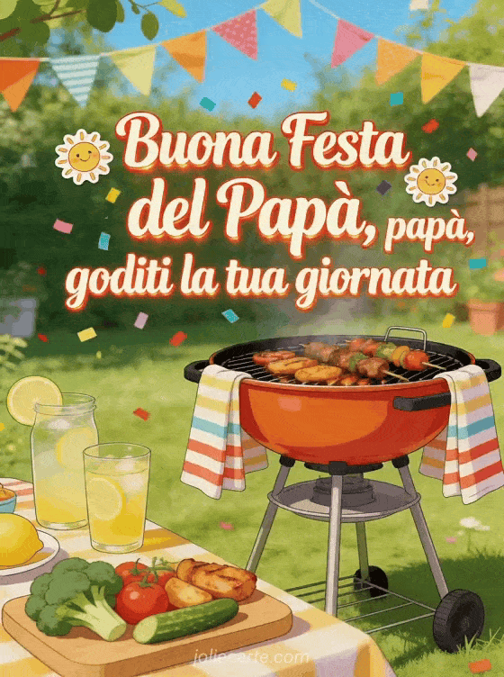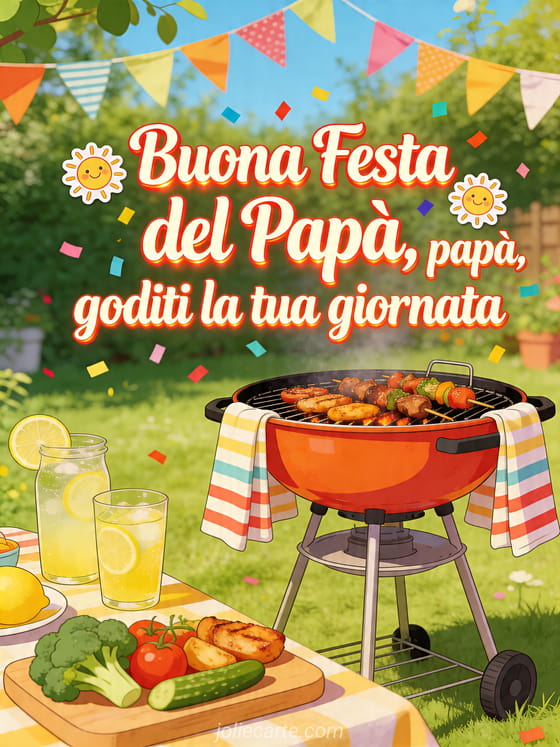 Augura a papà una giornata di sole con un'illustrazione vivace di barbecue, limonata, verdure arrosto e ghirlande festive in giardino. Puoi inviare anche buona festa papà amore mio, un biglietto festa al papà o un biglietto buona Festa del Papà.