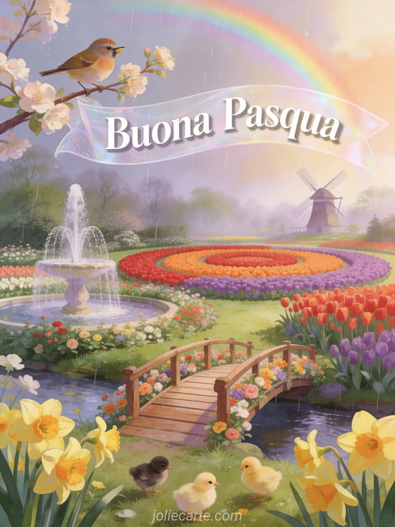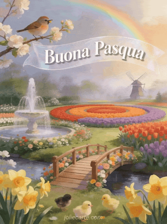 Festeggia la Pasqua con questo incantevole biglietto animato gratuito con un uccello che canta su un ramo fiorito accanto a una fontana del giardino di Keukenhof con aiuole di tulipani, una passerella di legno e pulcini tra i narcisi con un arcobaleno. Scopri anche carte virtuelle paques carte gratuite joyeuses paques.