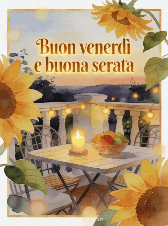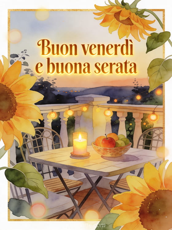 Condividi un messaggio felice di fine giornata con petali di girasole, un tavolo da patio accogliente, una candela accesa, una ciotola di frutta matura e luci calde della serata in acquerello. Scopri anche immagine buon venerdì e buon fine settimana, buon venerdì cartoline o testo per augurare un buon venerdì.