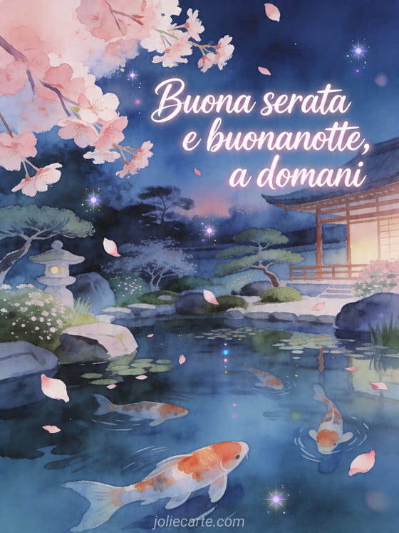 Condividi un saluto calmo e delicato con questo biglietto zen ambientato in un giardino giapponese al crepuscolo, con pesci koi e petali di ciliegio che cadono piano. Scopri anche buona serata buonanotte baci a domani, paesaggio buona serata a domani o buona serata a domani.