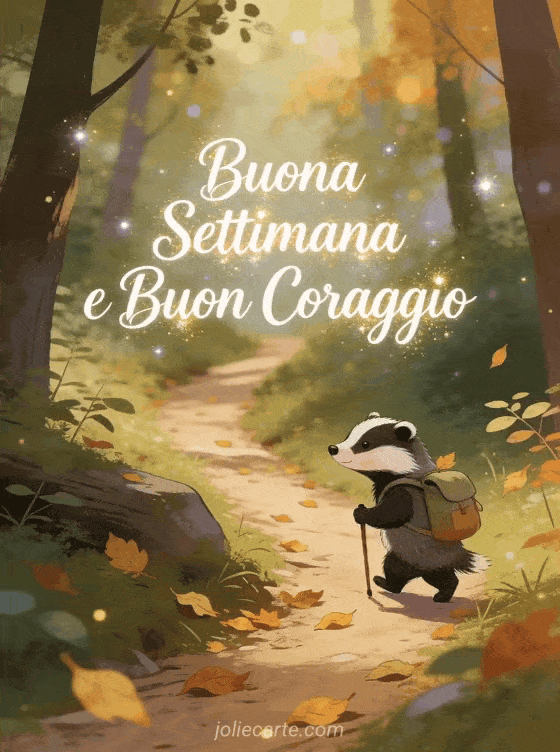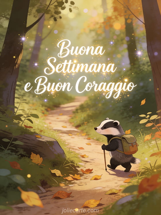 Solleva il morale dei tuoi cari con questo biglietto incoraggiante con un piccolo tasso determinato che cammina lungo un sentiero nel bosco con il suo zainetto. Scopri anche un biglietto buona settimana umoristico o un biglietto divertente buona settimana.