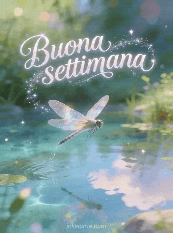 Condividi un magico augurio di buona settimana con questa cartolina con libellula dal fascino fiabesco. Scopri anche buona settimana a tutti umorismo, passa una buona settimana o cuore ciao buona settimana.