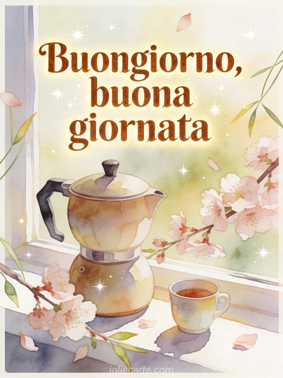 Augura una buona giornata con questo biglietto fresco ad acquerello, con una caffettiera arrotondata, una piccola tazza, rami di fiore di ciliegio, petali e un davanzale luminoso. Scopri anche buongiorno con caffè gif animata, buongiorno buon caffè gif o buongiorno cuore mio caffè.