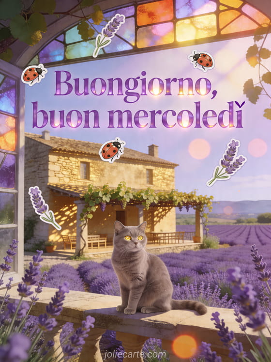 Condividi un bellissimo saluto del mercoledì mattina con campi di lavanda, un casale provenzale e un elegante gatto certosino. Scopri anche picmix buon mercoledì immagini, immagine gif animato buon mercoledì e tenerezza immagine buon mercoledì baci.
