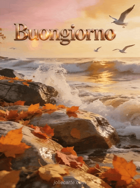 Invia un caloroso saluto di Buongiorno con una bella riva autunnale del mare, luce ramata e foglie rosse sugli scogli. Scopri anche una cartolina Buongiorno coppia o una cartolina Buongiorno fiori.