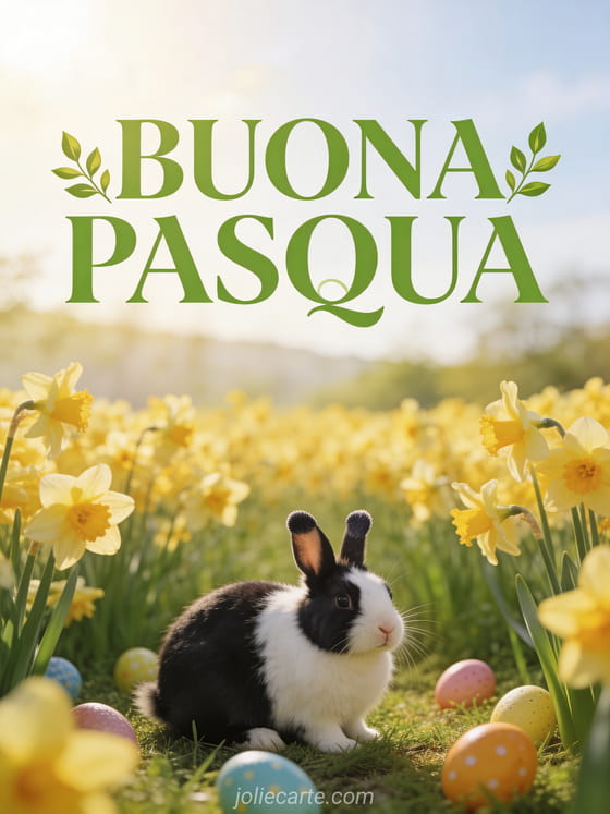 Condividi una bella immagine di coniglio di Pasqua con un tenero coniglio nano olandese tra narcisi e uova di Pasqua colorate. Scopri anche fiori di Pasqua immagini o una e-card Pasqua.