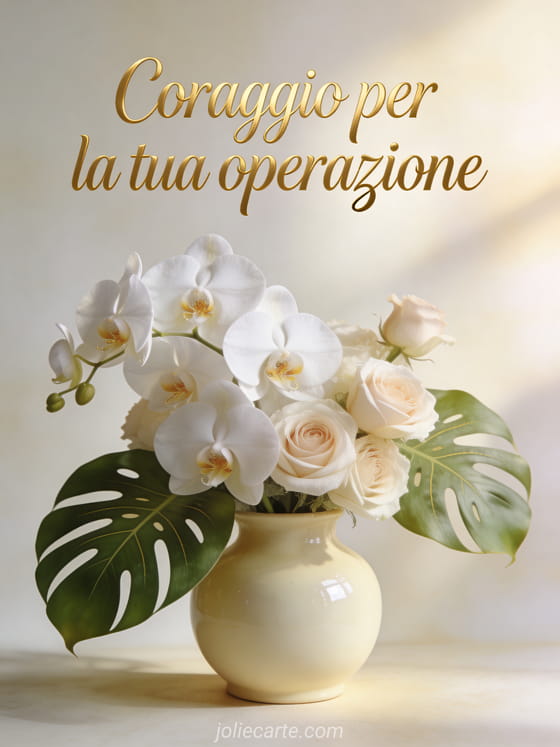 Invia caldi auguri di forza a chi si prepara per un'operazione. Questa elegante cartolina fotorealistica con orchidee bianche e rosa trasmette il tuo sincero sostegno. Scopri anche una cartolina di coraggio e pensiero, una cartolina di sostegno e coraggio o una cartolina confortante di pronta guarigione.