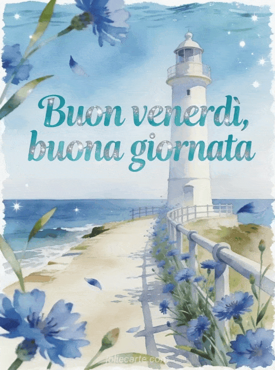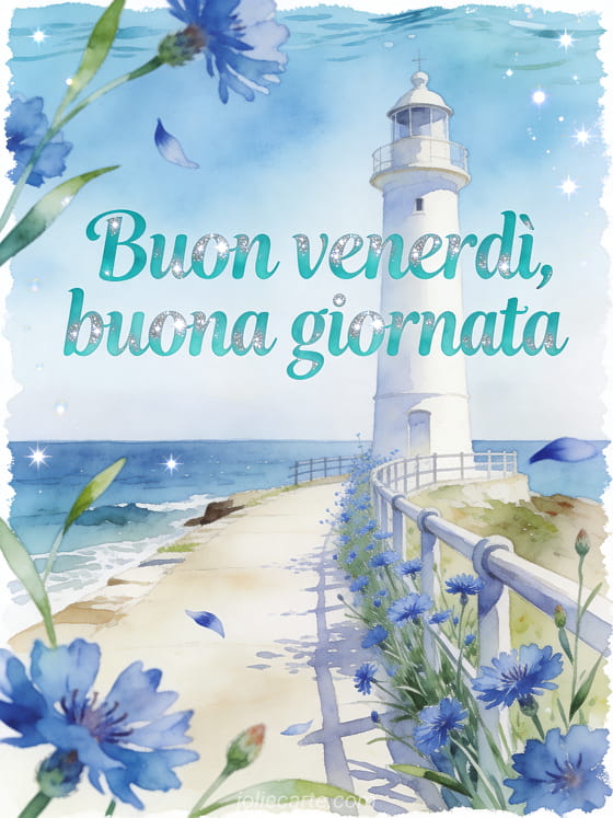 Condividi un saluto luminoso del venerdì con scritte turchesi, un sentiero sul mare, un faro bianco, fiordalisi blu e dettagli d'acqua scintillante. Scopri anche immagini di buon venerdì baci, un baci del venerdì gif o un gif buon venerdì freddo.