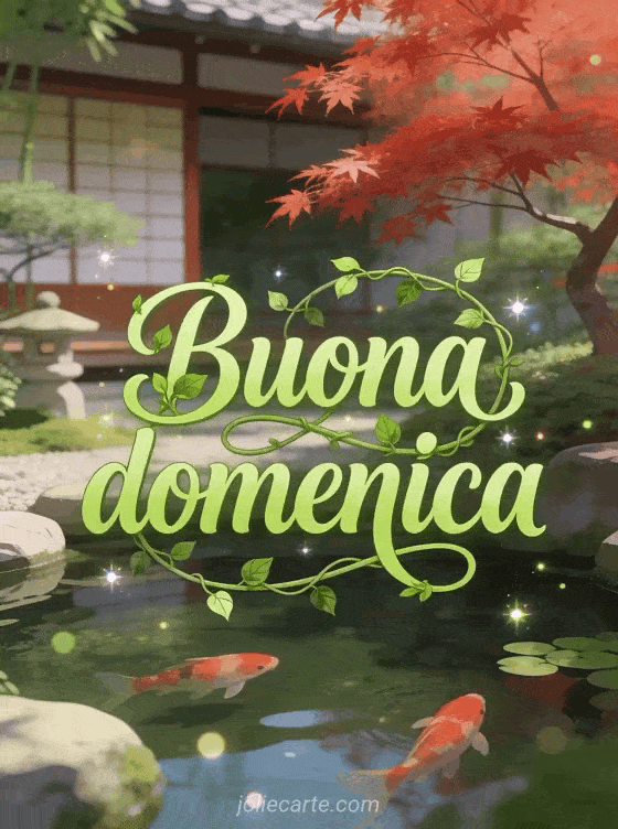 Condividi un saluto rilassante di buona domenica con scritta verde mela, un giardino giapponese sereno, un laghetto koi e un acero rosso in atmosfera zen. Scopri anche un biglietto di buona domenica in famiglia, una immagine buongiorno domenica o un biglietto di buona domenica amore mio con baci.