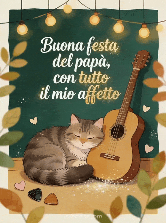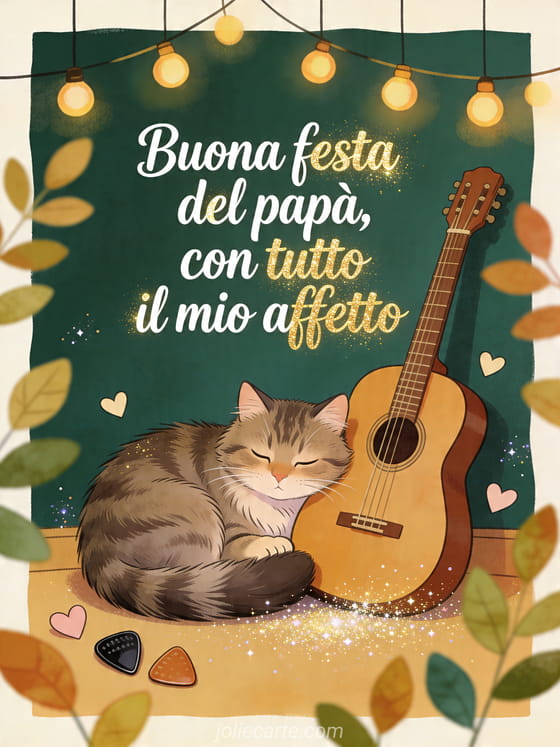 Invia un'immagine tenera di festa del papĂ con un'illustrazione accogliente da libro di fiabe: un gatto norvegese delle foreste accoccolato accanto a una chitarra acustica sotto luci calde, piccoli cuori e forme di foglie. Scopri anche parole tenere per la festa del papĂ , una poesia per la Festa del PapĂ o poesia buona festa papĂ benevolenza e tenerezza.