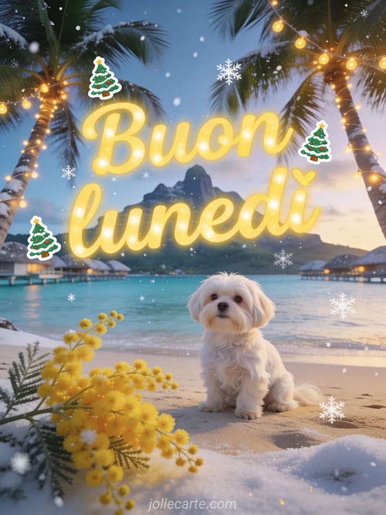 Invia un'immagine gratis buon lunedì con lettere gialle allegre, sticker di abeti innevati e una laguna di Bora Bora illuminata da calde luci natalizie. Condividi un augurio luminoso per iniziare la settimana e scopri anche animali buon lunedì gif, baci del lunedì gif o buongiorno lunedì cartolina.