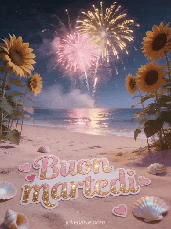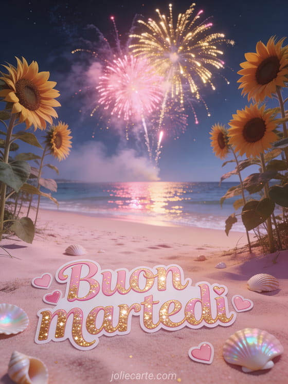 Invia un'immagine gratis buon martedì baci con lettere rosa pastello, conchiglie, cuori e fuochi dorati sopra una tranquilla spiaggia rosa. Condividi un augurio tenero durante la settimana e scopri anche zen tenerezza citazione positiva buon martedì, passare un buon martedì o buon martedì e buona giornata gif.