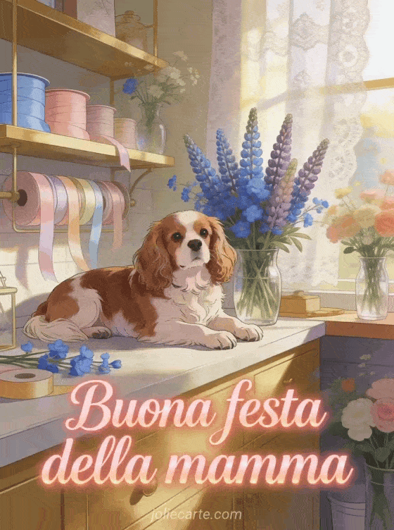 Festeggia la mamma con questa graziosa immagine gratuita per la festa della mamma con lettering corallo rosa e un Cavalier King Charles sdraiato tra fiordalisi e lupini. Scopri anche buona festa della mamma o illustrazione festa della mamma.