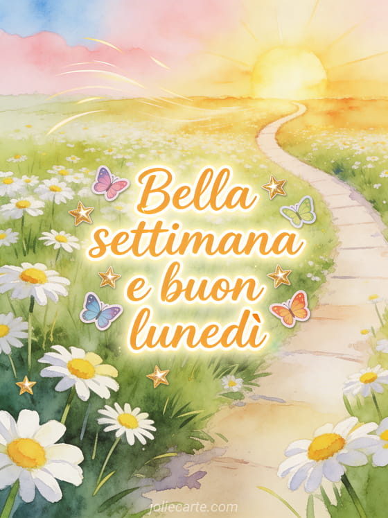 Invia bella settimana e buon lunedì con un ampio prato pieno di margherite, un sentiero curvo verso un'alba dorata, farfalle colorate e stelle. Scopri anche buongiorno buon lunedì e buona settimana baci, buongiorno lunedì immagine o buona settimana e buon lunedì immagine.