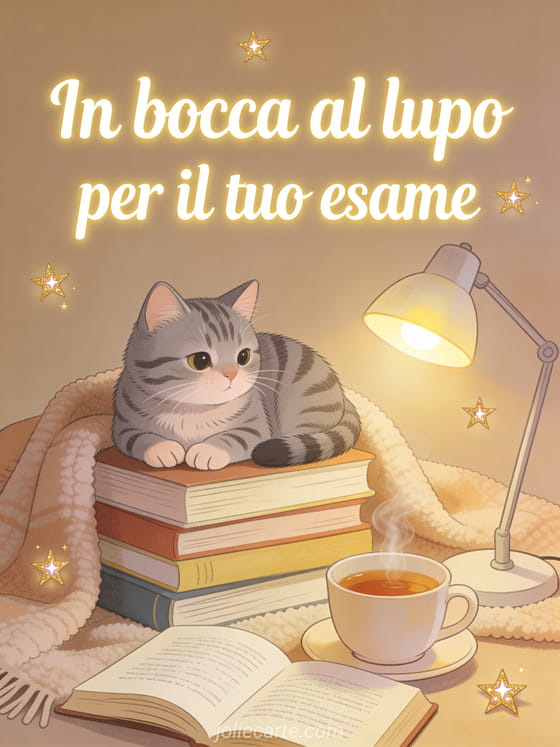In bocca al lupo per il tuo esame un biglietto accogliente di incoraggiamento con un adorabile gatto studioso