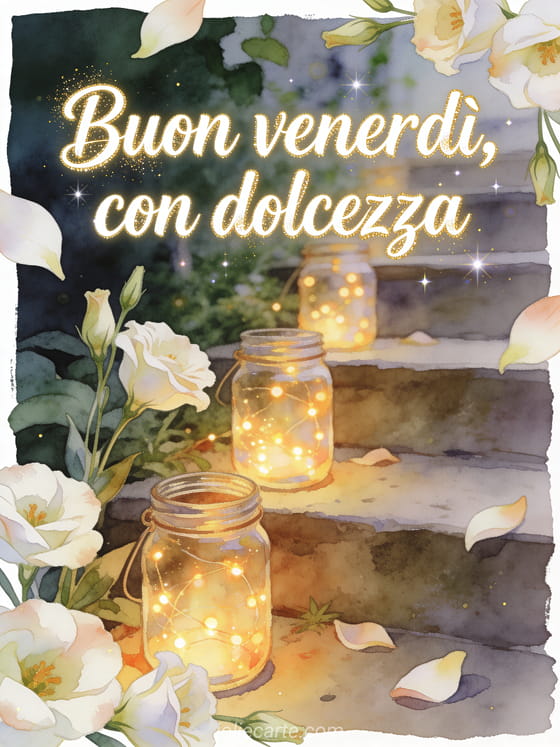 Condividi un dolce saluto di buon venerdì con fiori di lisianto, barattoli di vetro pieni di piccole luci calde e un gradino del giardino in acquerello. Scopri anche buon venerdì citazione positiva immagine, immagini buongiorno venerdì o buon venerdì baci gif.