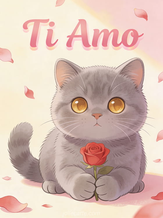 Invia questo adorabile biglietto Ti Amo con un grazioso gattino grigio British Shorthair dagli occhi dorati e rotondi che tiene una piccola rosa rossa tra le zampette su sfondo crema con petali sparsi. Un modo tenero per dire ti amo. Scopri anche un biglietto con baci d'amore o una bella immagine ti amo.