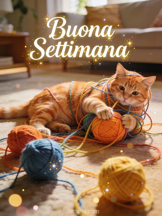 Immagine umorismo buona settimana una divertente immagine umoristica per augurare una buona settimana con un gatto aggrovigliato nella lana