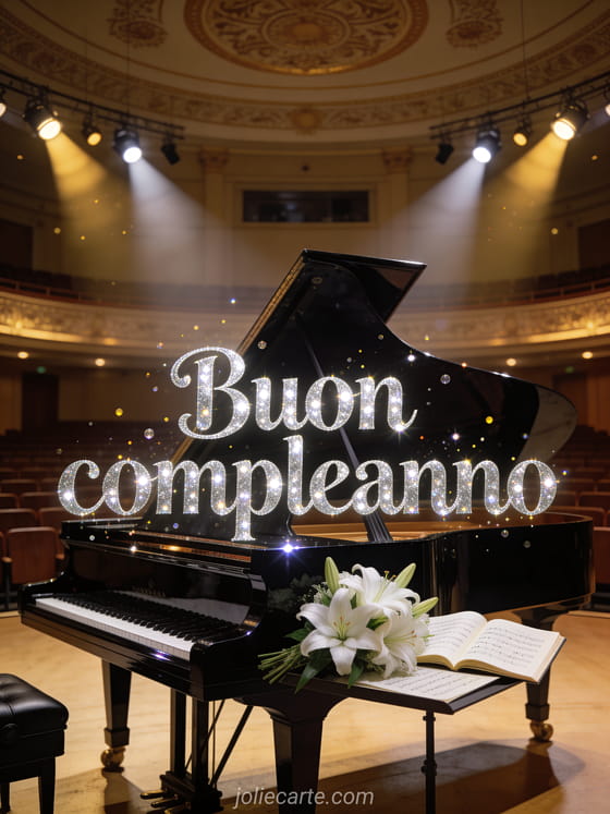 Sorprendi l'uomo speciale della tua vita con questa elegante cartolina animata di buon compleanno. Un grande pianoforte a coda, lilium bianchi e una sala da concerto creano un'atmosfera raffinata e indimenticabile. Scopri anche una cartolina virtuale compleanno uomo gratis o una gif compleanno uomo umorismo.