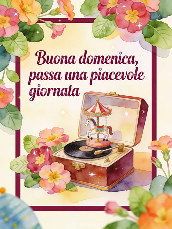 Augura buona domenica, passa una piacevole giornata con lettere color prugna, un carillon aperto, un piccolo cavallo da giostra e primule oltre il bordo. Scopri anche buona domenica calda immagine, buona domenica immagine gif o buona domenica testo.