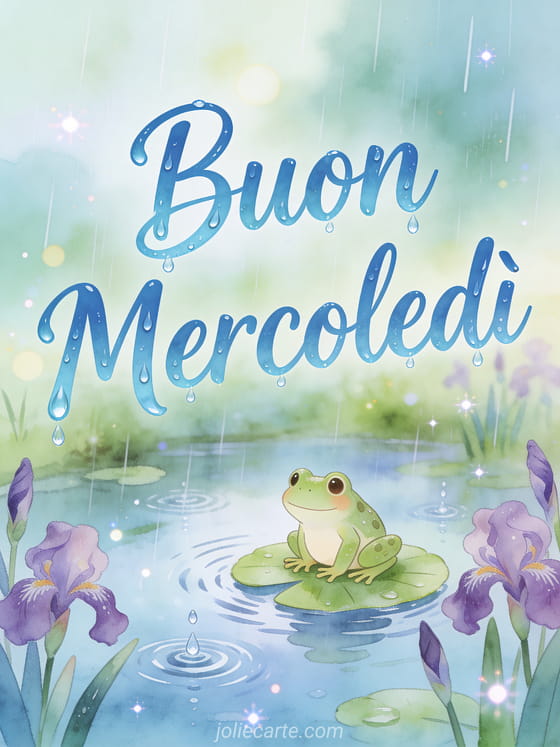 Condividi un sereno mercoledì piovoso con questa adorabile cartolina della ranocchia sulla ninfea. Scopri anche una cartolina buon mercoledì ti amo o una cartolina buon mercoledì cavalli.