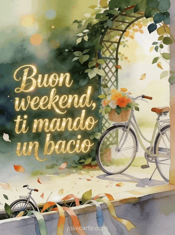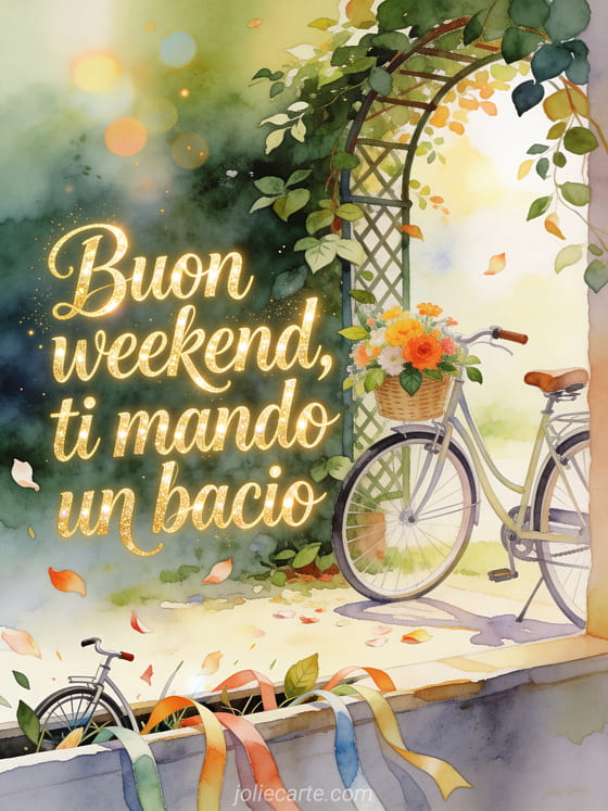 Condividi un messaggio tenero di fine settimana con bagliore champagne, una bicicletta vintage, un pergolato frondoso e un cestino di fiori colorati. Scopri anche tanti baci buon weekend, buon weekend e tanti baci o buon weekend bacioni.