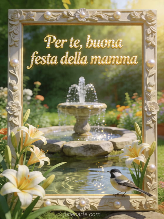 Condividi immagini buona festa della mamma con lettere perlate, riflessi dorati e un giardino fotorealistico con fontana di pietra. Una ballerina bianca sta accanto a emerocallidi fresche e acqua scintillante in questo biglietto gioioso di primavera. Scopri anche fotografie della festa della mamma, cartoline per la festa della mamma o buona festa della mamma per la mia mamma.